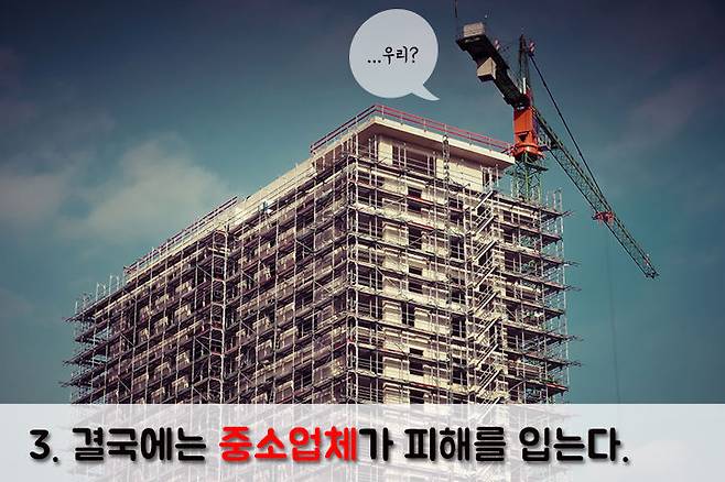 또한, 이러한 변화는 오히려 중견 건설사와 중소건설사를 압박하는 꼴이라고 말했다. 원정업체의 낙찰 원가를 낮추면 그만큼 하청 업체의 원가도 낮춰야 한다. 이는 부실공사가 발생할 수밖에 없도록 떠미는 꼴밖에 더 되냐는 것이다.